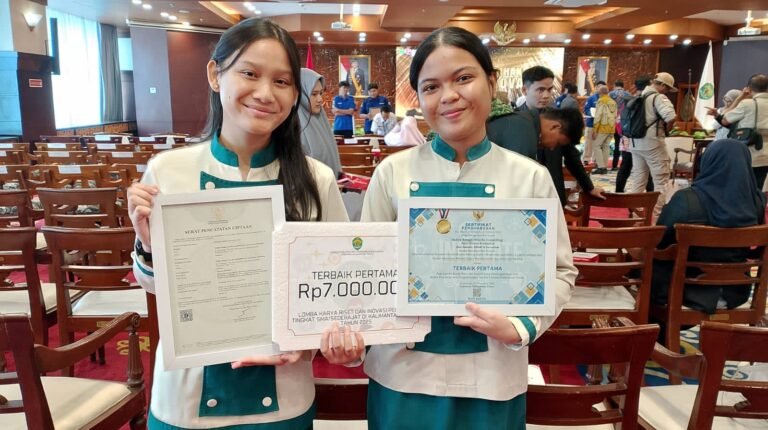 SAMARINDA: Dua siswi kelas XII SMA Negeri 10 Samarinda, Nadine Rangga Priscilia Sampeliling dan Astri Kirana Pramudita, berhasil meraih Juara Pertama Lomba Karya Riset dan Inovasi Pelajar SMA/Sederajat 2025 yang diselenggarakan oleh Badan Riset dan Inovasi Daerah (BRIDA) Kalimantan Timur (Kaltim).