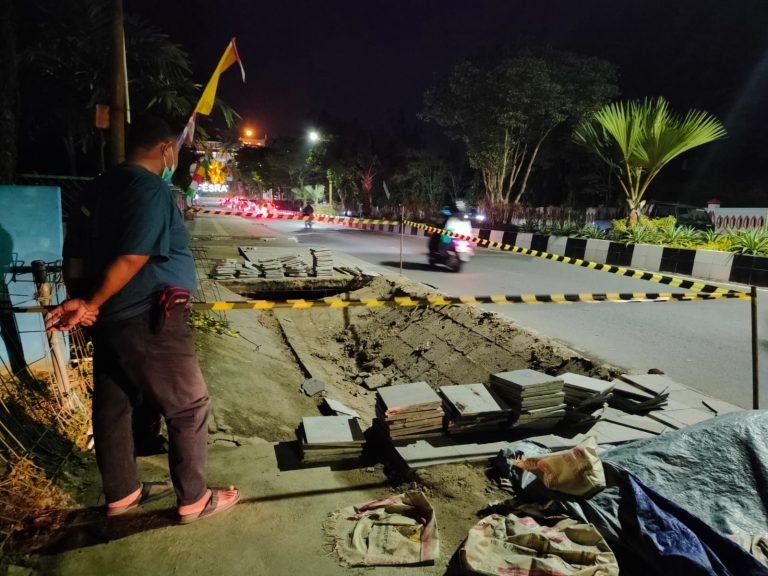 Hingga pukul 20.00 WITA di lokasi kejadian trotoar amblas telah dipasang garis pengaman (safety line).