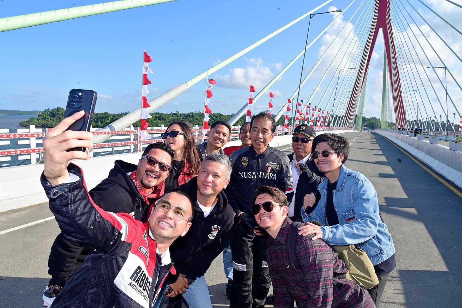 Dari Tol Balikpapan – IKN Seksi 3A, Presiden Jokowi dan Pj Gubernur Kaltim Akmal Malik serta rombongan menggunakan sepeda motor menuju Jembatan Pulau Balang dengan panjang jalan sekitar 15 km.