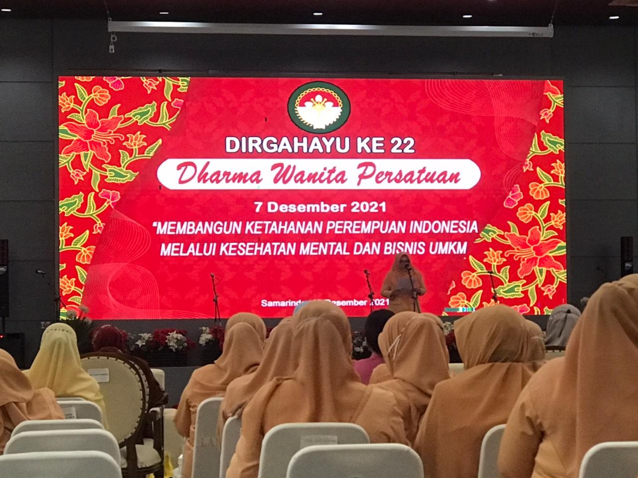 Samarinda – Dharma Wanita Persatuan (DWP) Kaltim rayakan upacara peringatan HUT ke-22 di Pendopo Odah Etam Samarinda, Jumat (10/12/2021) dengan mengusung tema “Membangun Ketahanan Perempuan Indonesia Melalui Kesehatan Mental dan Pemulihan Bisnis UMKM”.