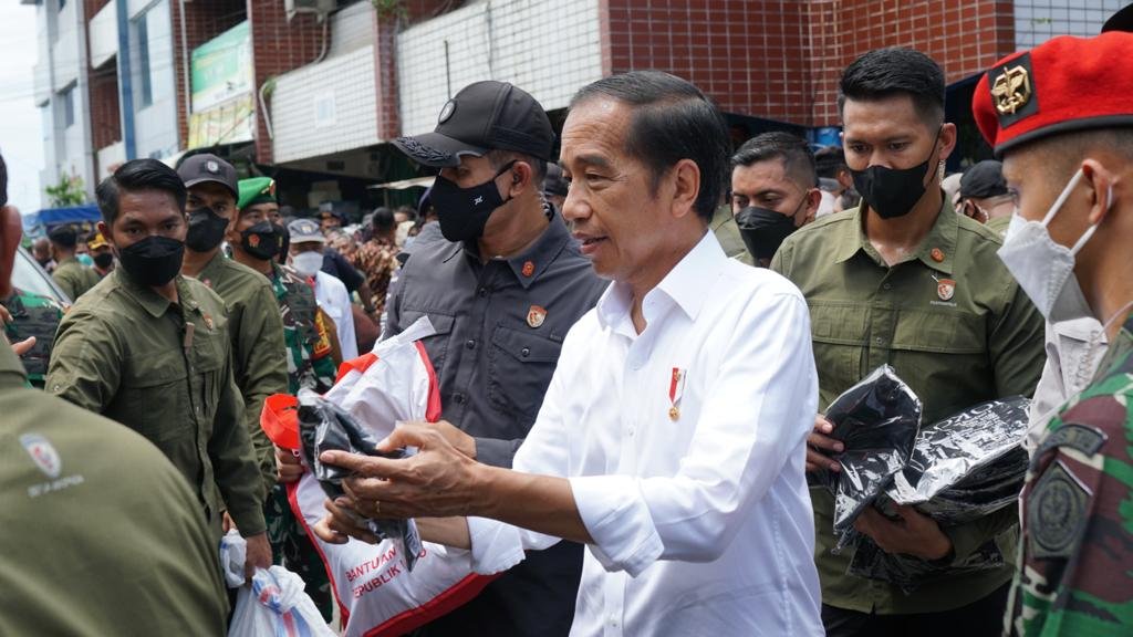 Balikpapan – Presiden Republik Indonesia (RI) Joko Widodo didampingi Gubenur Kalimantan Timur (Kaltim) Isran Noor menyapa dan menyemangati para pedagang di Pasar Rakyat Klandasan di sela kunjungannya ke Kaltim, Selasa (25/10/2022).