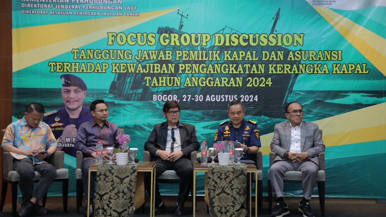 BOGOR : Direktorat Jenderal Perhubungan Laut melalui Direktorat Kesatuan Penjagaan Laut dan Pantai (KPLP) menggelar Focus Group Discussion (FGD) Tanggung Jawab Pemilik Kapal dan Asuransi Terhadap Kewajiban Pengangkatan Kerangka Kapal.