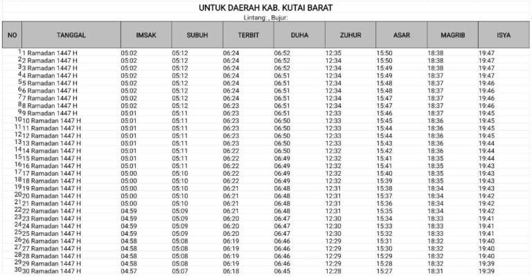 Berikut disajikan Jadwal Imsakiah Ramadan 1447 Hijriah/2026 Masehi untuk wilayah Kabupaten Kutai Barat, Provinsi Kalimantan Timur.