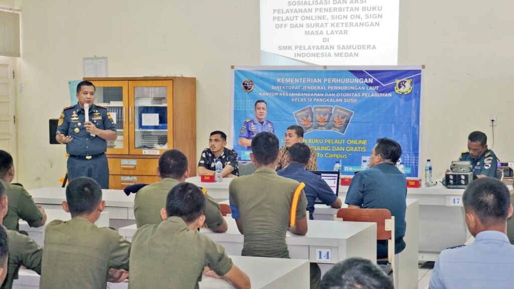 Hal tersebut disampaikan Kepala Kantor KSOP Kelas IV Pangkalan Susu, Merdi Loi, SE, MM, saat membuka secara serempak Program Buku Pelaut Online Goes to Campus di Politeknik Adiguna Maritim Indonesia Medan, Akademi Maritim Belawan, SMK Pelayaran Samudera Indonesia dan SMK Pelayaran Buana Bahari di Medan, Jumat (28/7/2023).