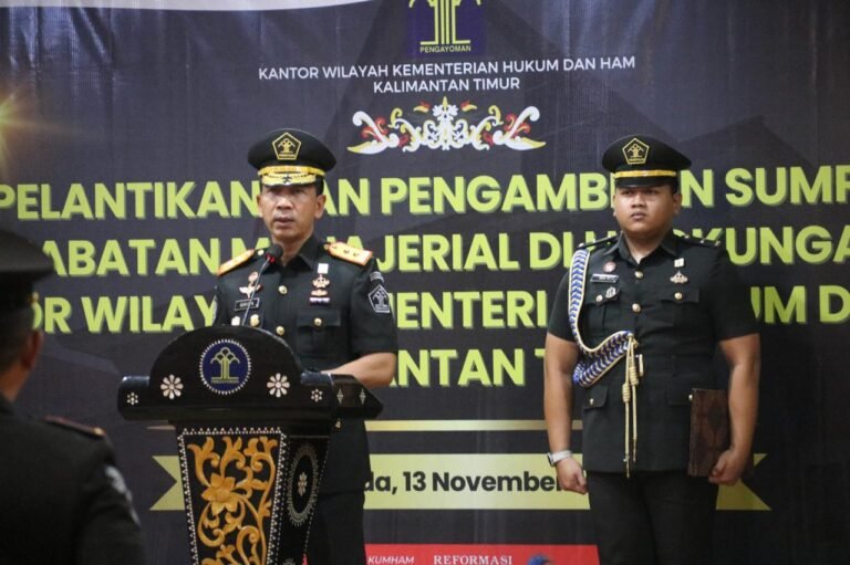 SAMARINDA : Gun Gun Gunawan, Kepala Kantor Wilayah Kementerian Hukum dan HAM Kalimantan Timur (Kaltim), memimpin pelantikan 16 pejabat baru untuk memperkuat struktur organisasi dan meningkatkan pelayanan hukum di wilayah Kalimantan Timur dan Kalimantan Utara.