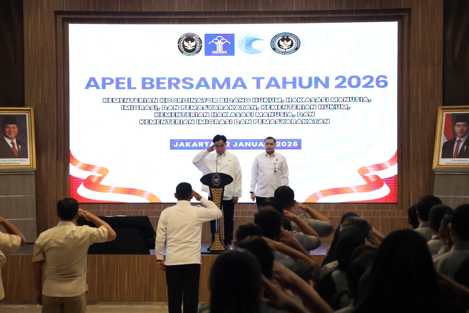 SAMARINDA: Jajaran Kantor Wilayah Kementerian Hukum Kalimantan Timur (Kaltim) mengikuti Apel Bersama Awal Tahun 2026 di lingkungan Kementerian Koordinator Bidang Hukum, HAM, Imigrasi, dan Pemasyarakatan (Kemenko Kumham Imipas), Senin, 12 Januari 2026.