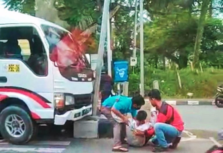 BONTANG : Sebuah mini bus menabrak traffic light simpang BSD Jalan Cipto Mangunkusumo, Kota Bontang, Jumat (20/1/2023).
