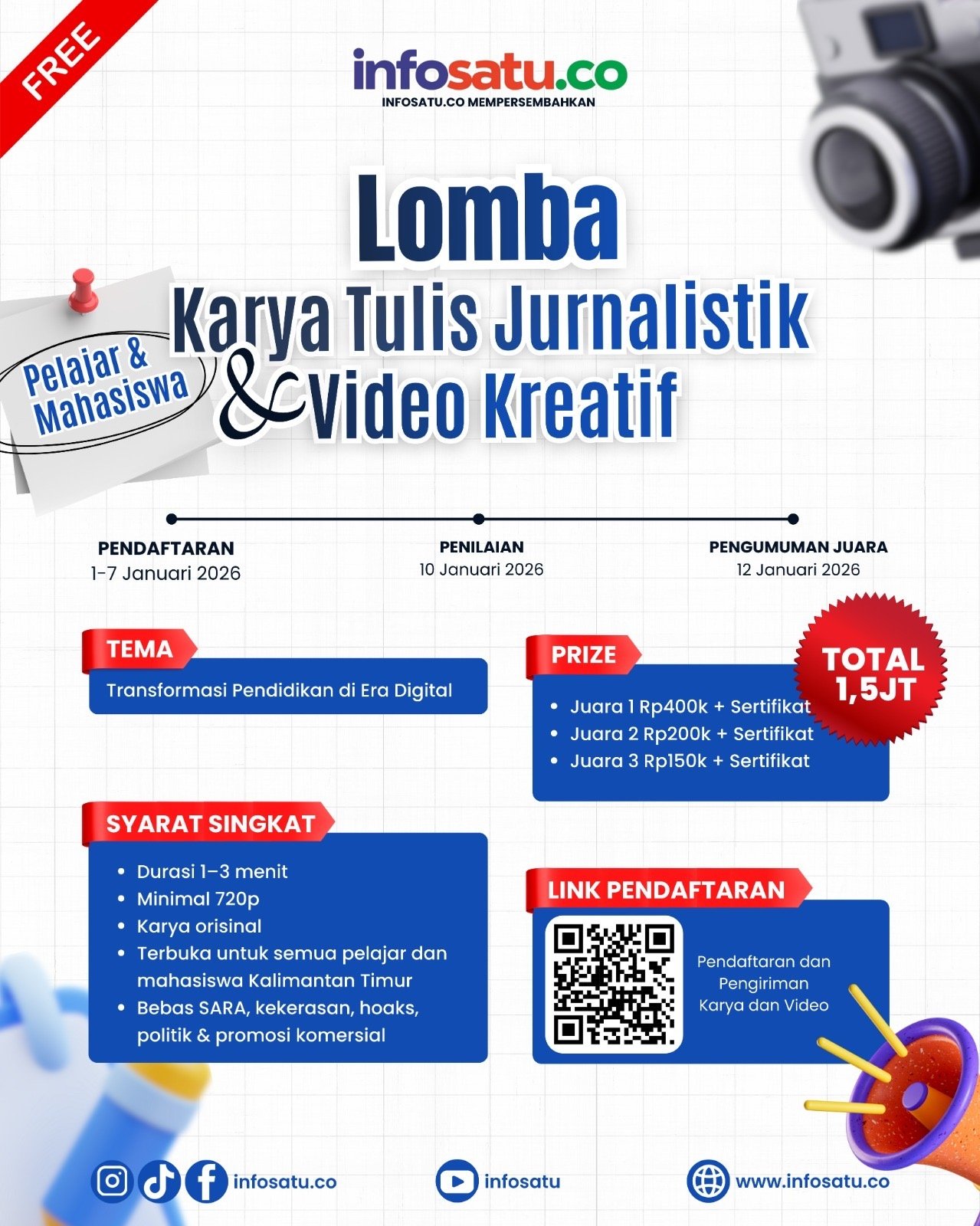 “Melalui lomba ini, kami berharap lahir karya-karya yang jujur, kreatif, dan berdampak. Ini juga menjadi bagian dari upaya kami menyiapkan generasi muda yang melek media dan siap bersaing di era digital,” pungkasnya.