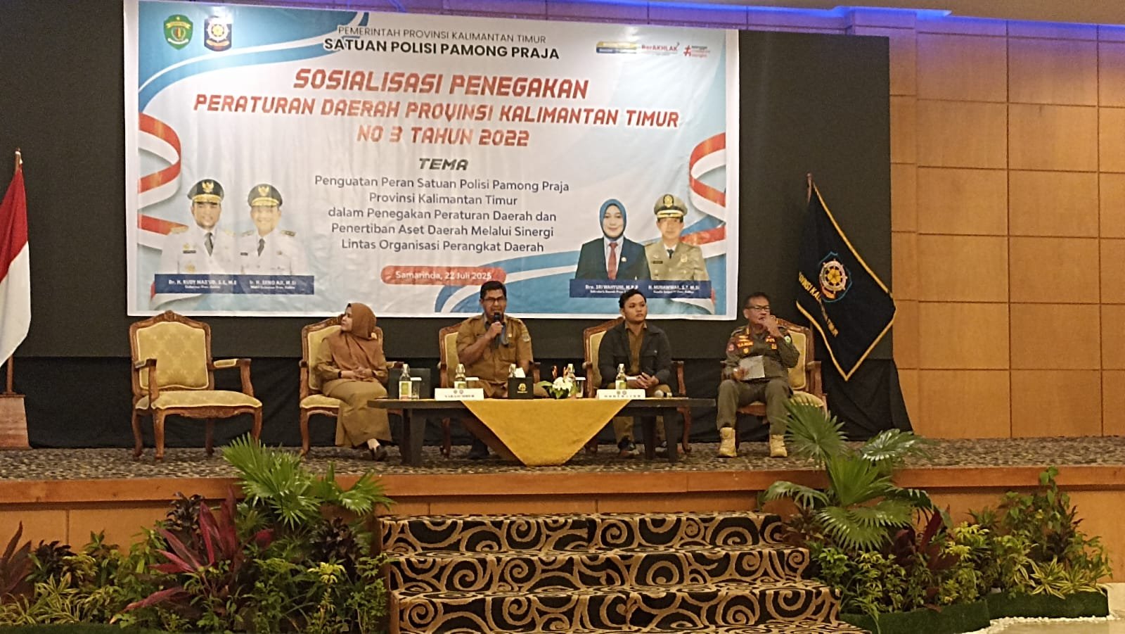 SAMARINDA: Satuan Polisi Pamong Praja (Satpol PP) Provinsi Kalimantan Timur (Kaltim) menggelar Sosialisasi Penegakan Peraturan Daerah (Perda) Nomor 3 Tahun 2022 tentang Pengelolaan Barang Milik Daerah (BMD), di Hotel Puri Senyiur, Samarinda, Senin 21 Juli 2025.