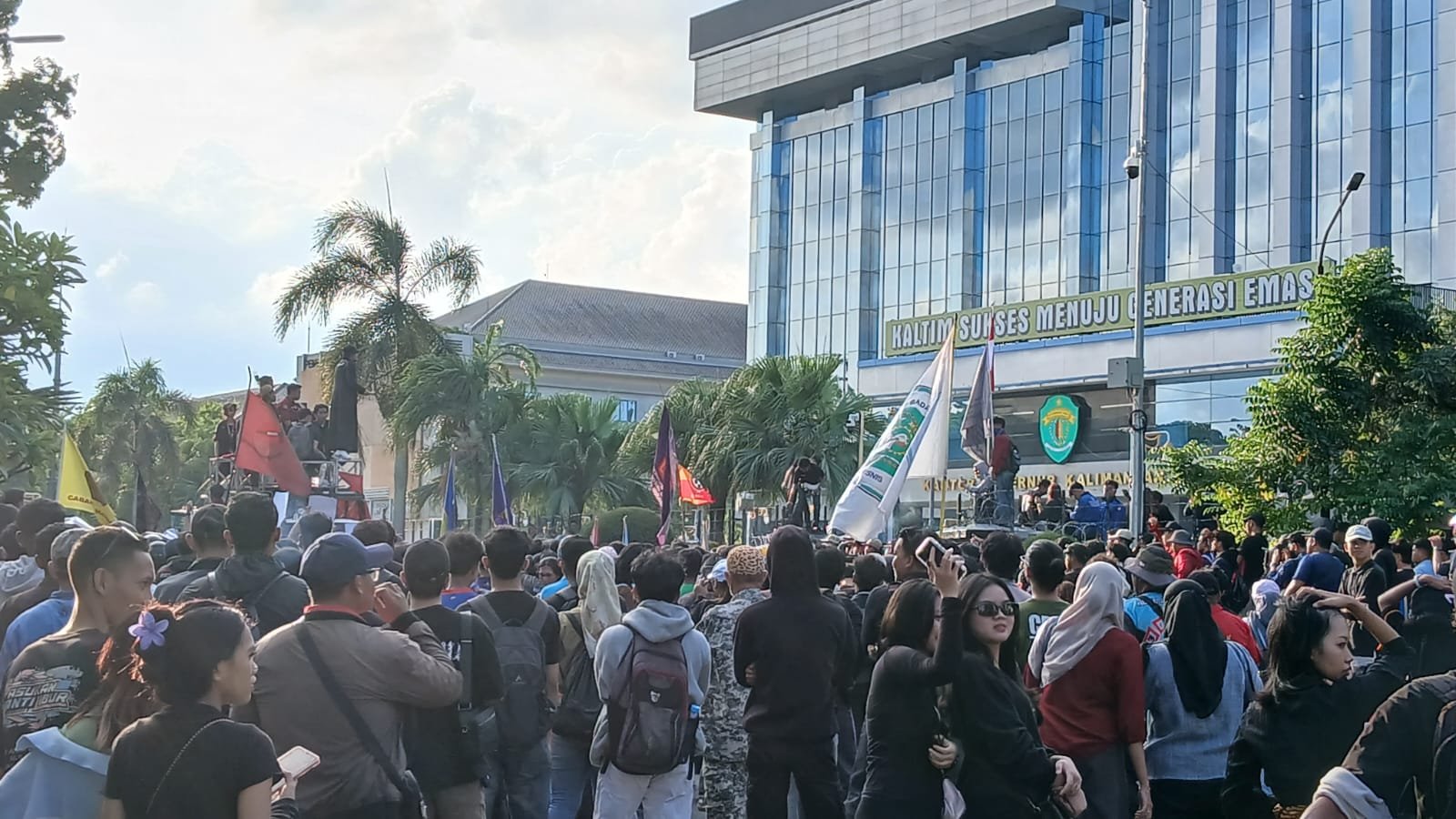 Menjelang sore, massa membentangkan spanduk raksasa bertuliskan “KALTIM DARURAT KKN” sebagai simbol protes terhadap dugaan praktik korupsi, kolusi, dan nepotisme.