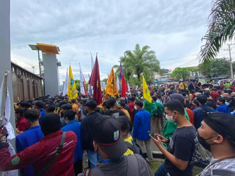 Samarinda – Pagar gedung DPRD Kaltim kembali dipenuhi masa yang menolak sejumlah kebijakan pemerintah karena dinilai tidak prorakyat, Rabu (6/4/2022). Sebanyak 13 lembaga yang tergabung dalam Aliansi Mahakam (Masyarakat Kalimantan Timur Menggugat) hari ini turun ke jalan dengan membawa tiga tuntutan.
