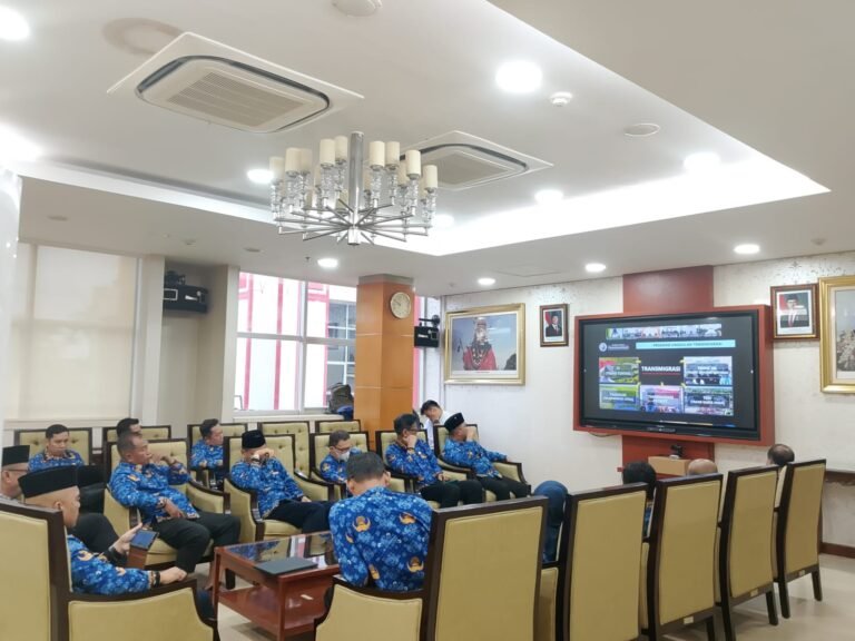 Para pejabat teras di lingkup Pemerintah Kabupaten Kutai Kartanegara (Pemkab Kukar) mengikutinya di ruang rapat sekretaris daerah.